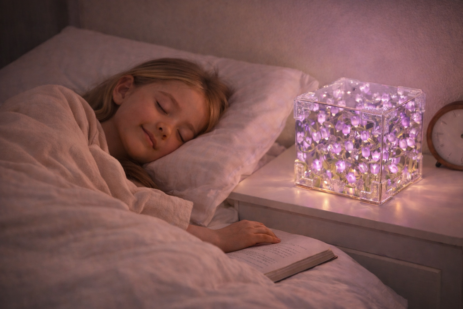 The lamp produces minimal heat and soft lighting, making it suitable for gentle night illumination. Adult supervision is recommended during assembly.